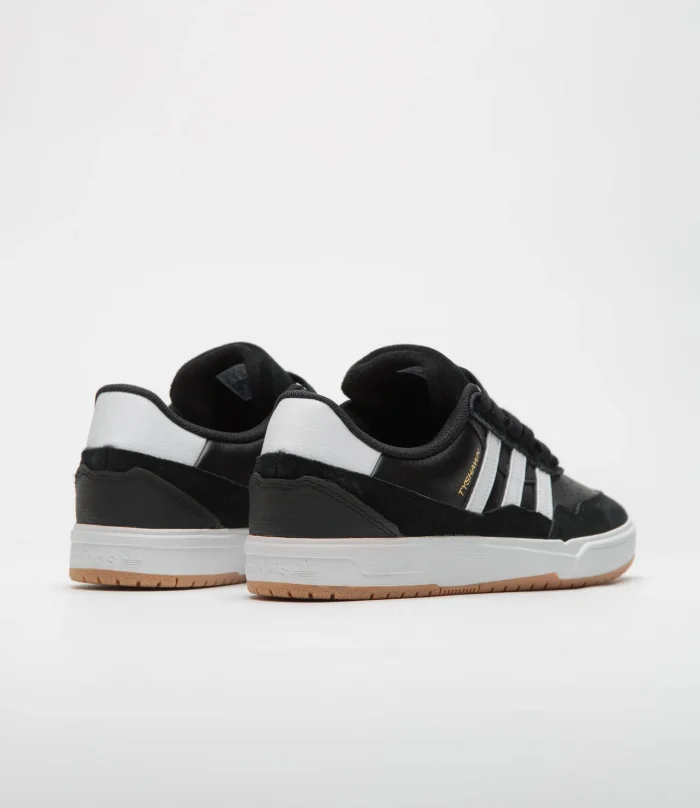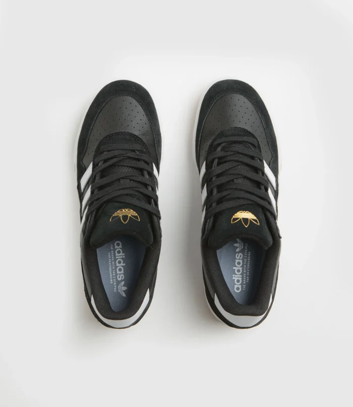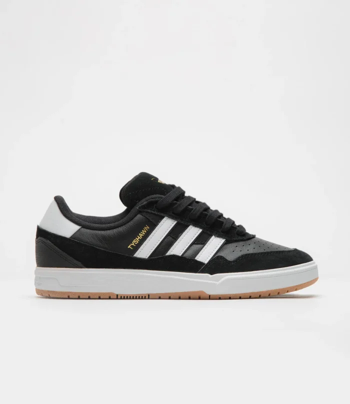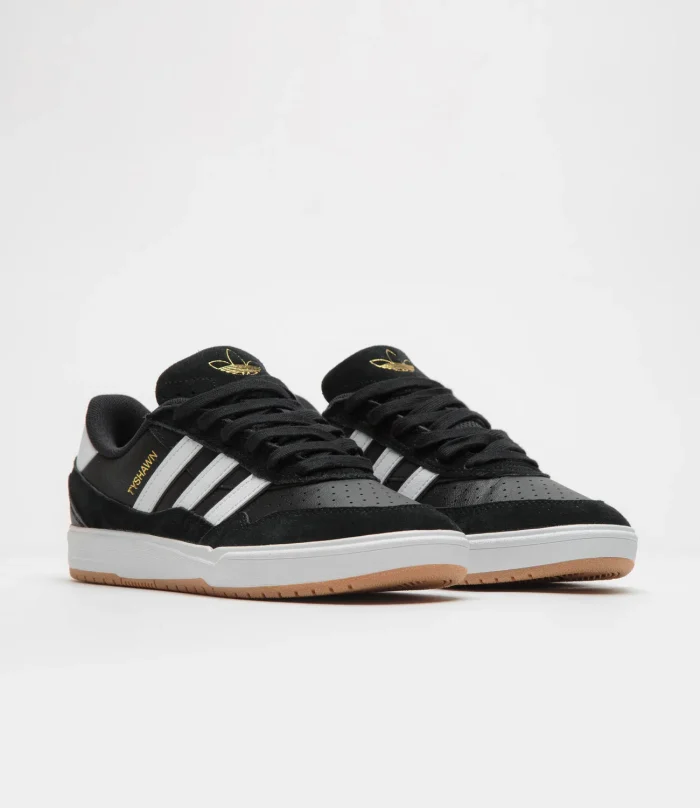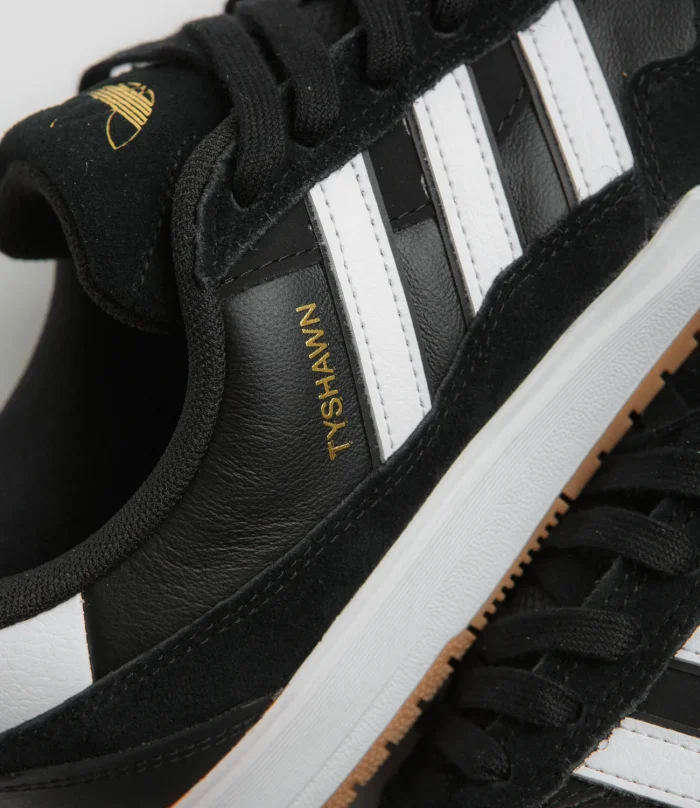 Adidas SkateboardingZapatillas Adidas Tyshawn II en Negro Núcleo, Blanco y Goma. La segunda firma del skater Tyshawn Jones, estas adidas Tyshawn II están diseñadas con paneles de ante y cuero en la parte superior. Con una puntera perforada de doble capa, una entresuela Lightstrike y una suela exterior de goma, estas adidas Tyshawn II negras se completan con una lengüeta de ante en relieve, logo dorado y detalles de las 3 Rayas blancas en contraste.