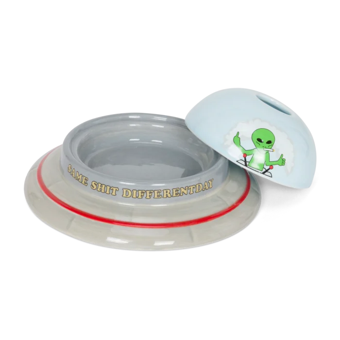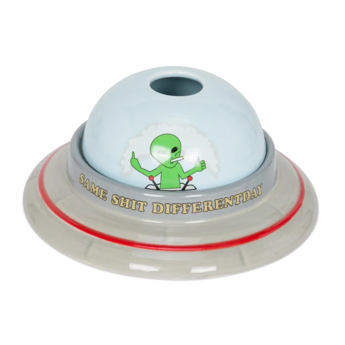Lleva tu espacio a otra galaxia con este porta incienso cerámico de Ripndip. Con un diseño de OVNI y el icónico Alien de la marca, este accesorio incluye la frase “Same Shit Different Day” grabada en la base. El humo sale por la parte superior, creando un efecto visual único. Una pieza de colección esencial para cualquier fan del streetwear y la cultura urbana.