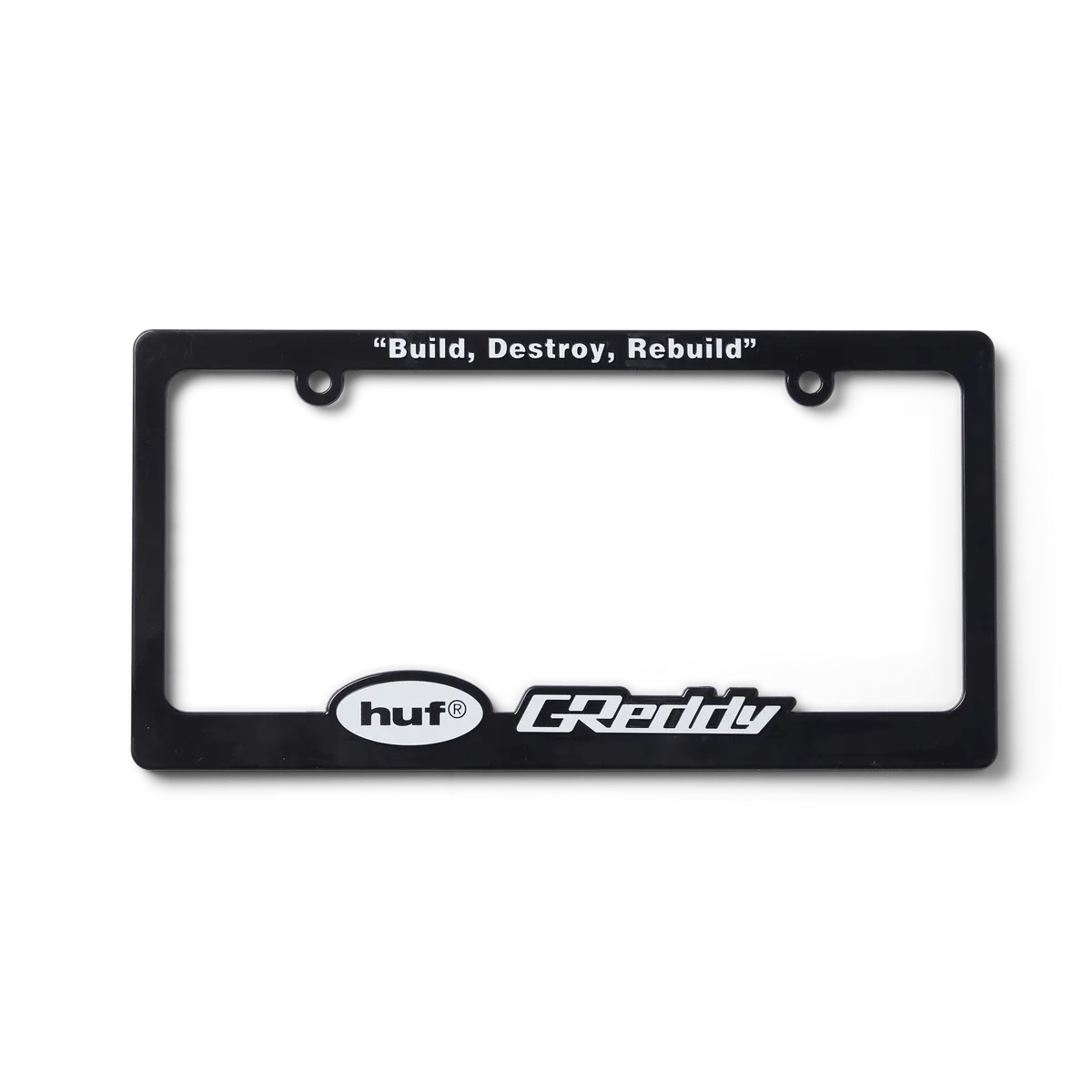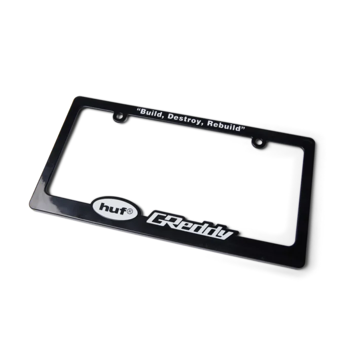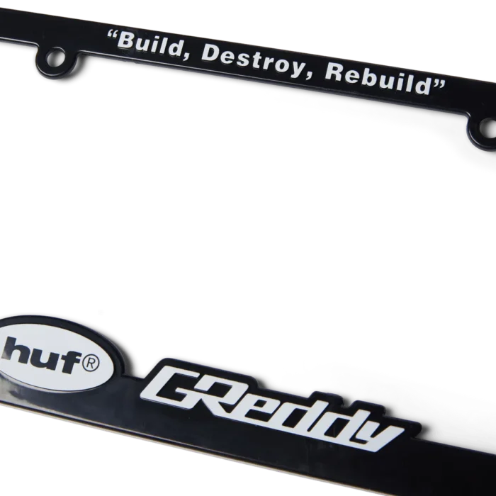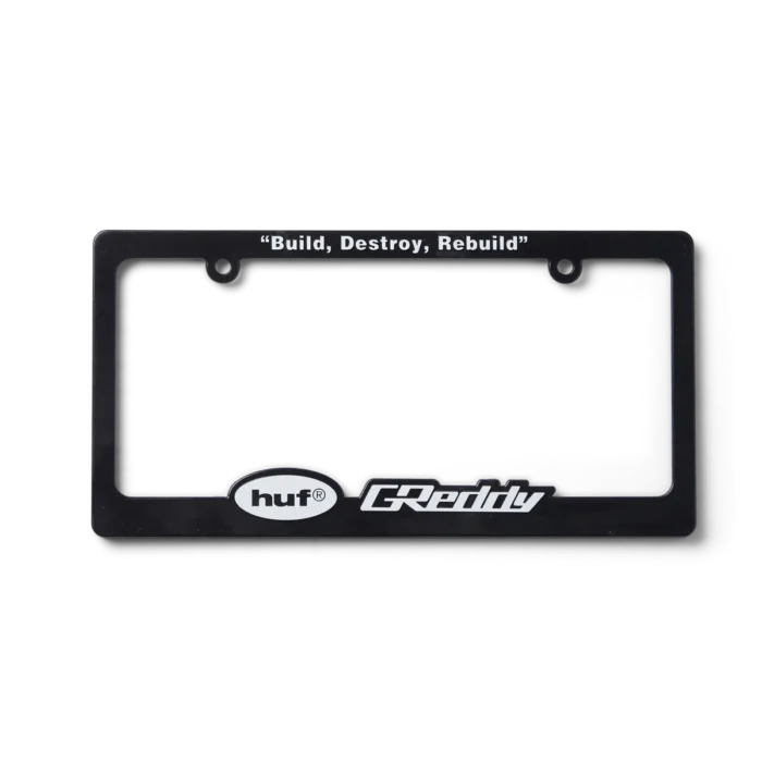 HUFEl toque final perfecto, el marco de matrícula HUF x GReddy está construido con logotipos personalizados y la frase “Construir, destruir, reconstruir”.