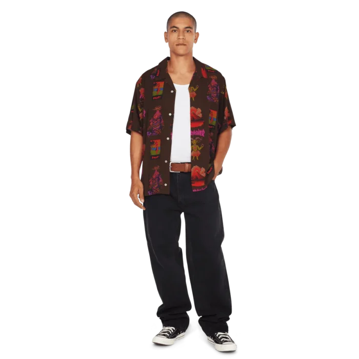 HUFLa camisa hawaiana HUF x Thrasher, confeccionada con ilustraciones de recuerdo personalizadas y una cabra patinadora con temática de isla, anima una prenda básica del resort con un ajuste relajado y un estampado completo.
