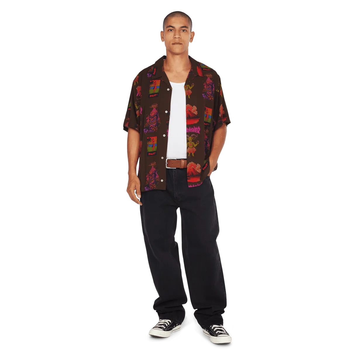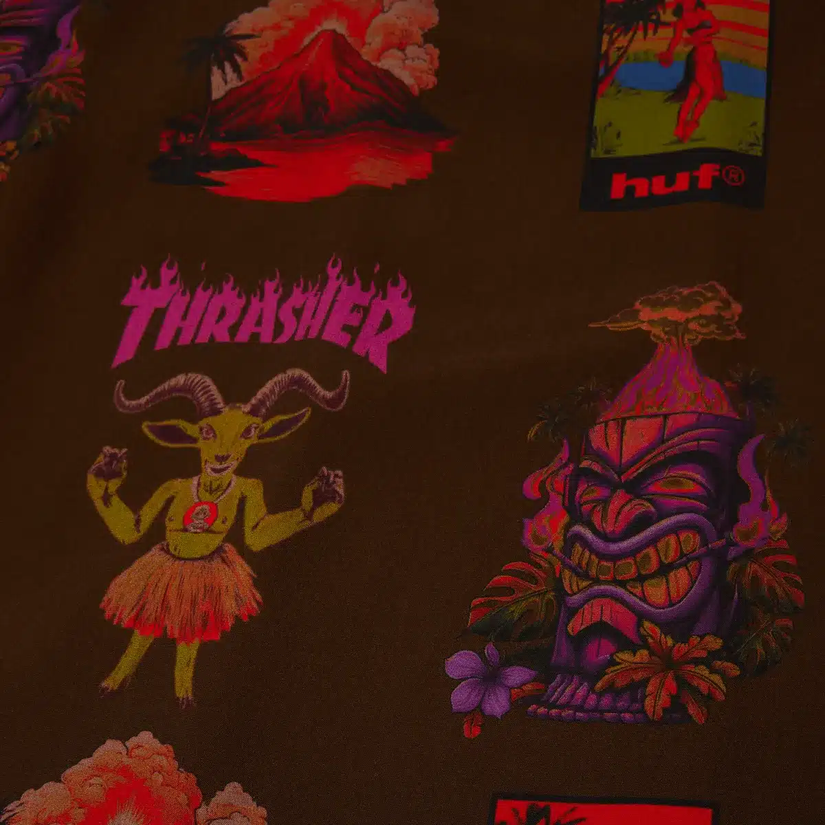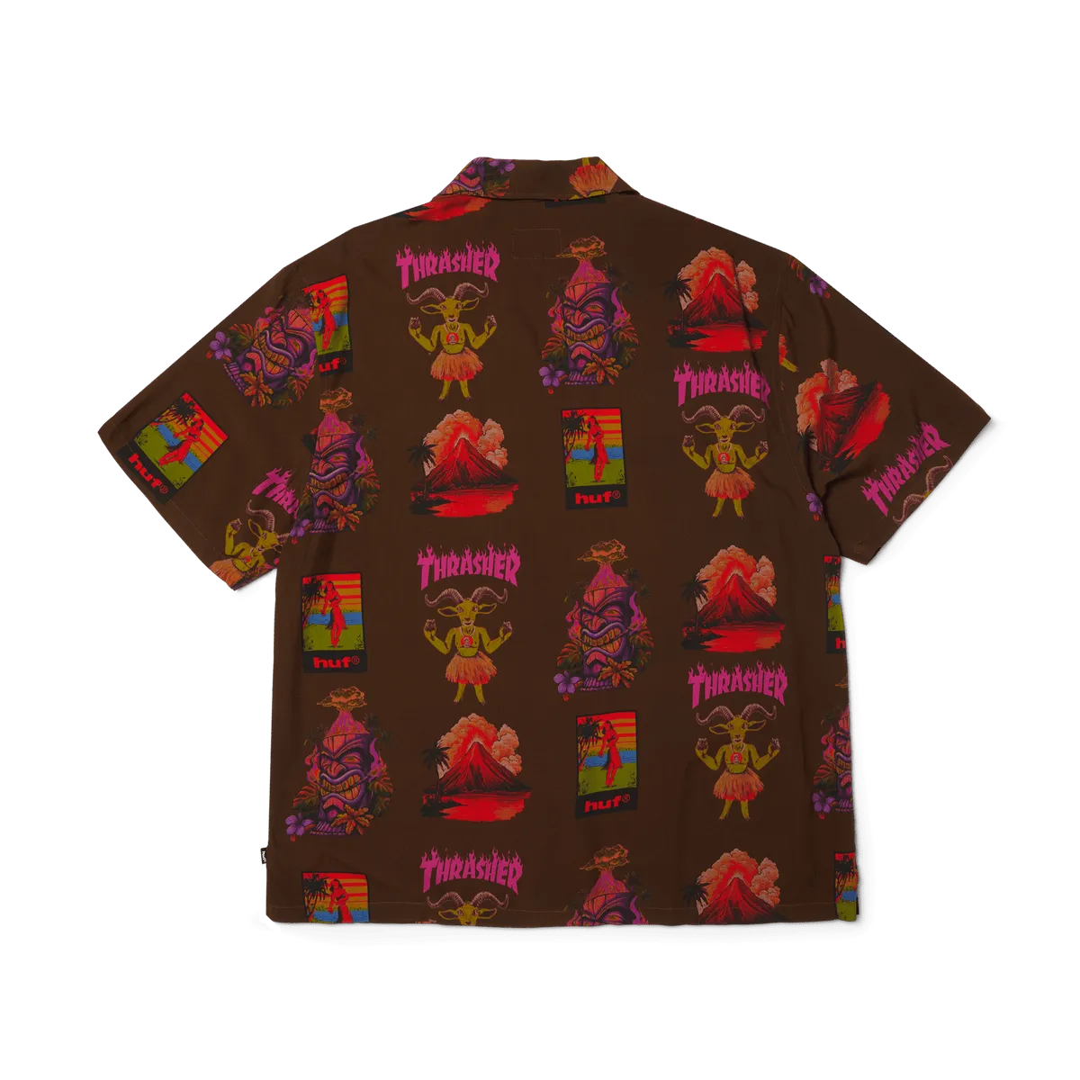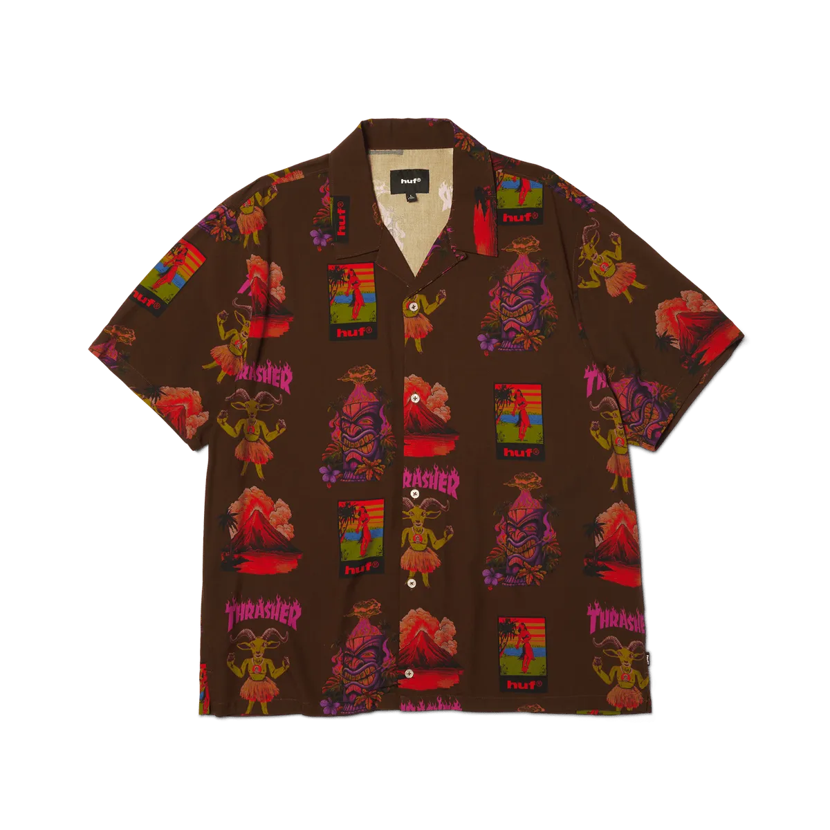 HUFLa camisa hawaiana HUF x Thrasher, confeccionada con ilustraciones de recuerdo personalizadas y una cabra patinadora con temática de isla, anima una prenda básica del resort con un ajuste relajado y un estampado completo.