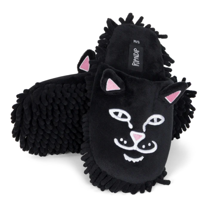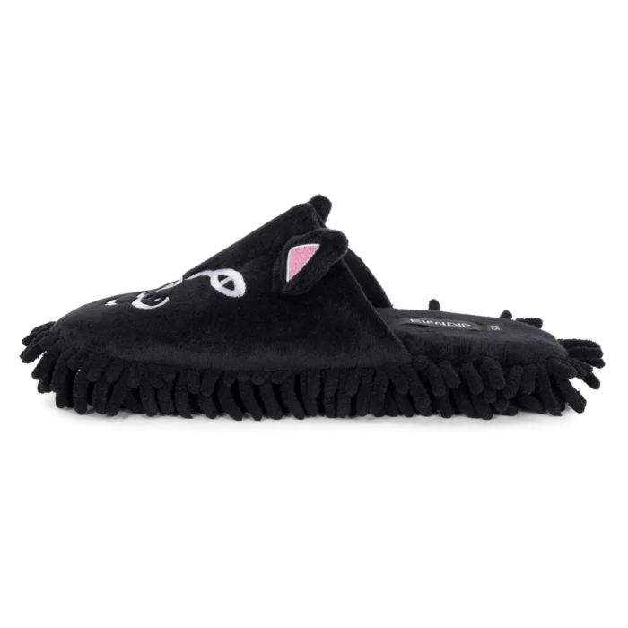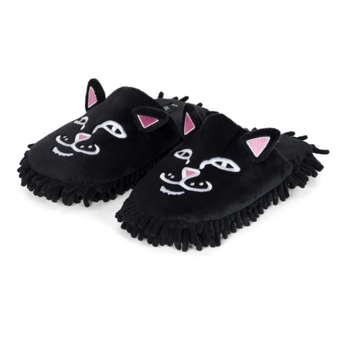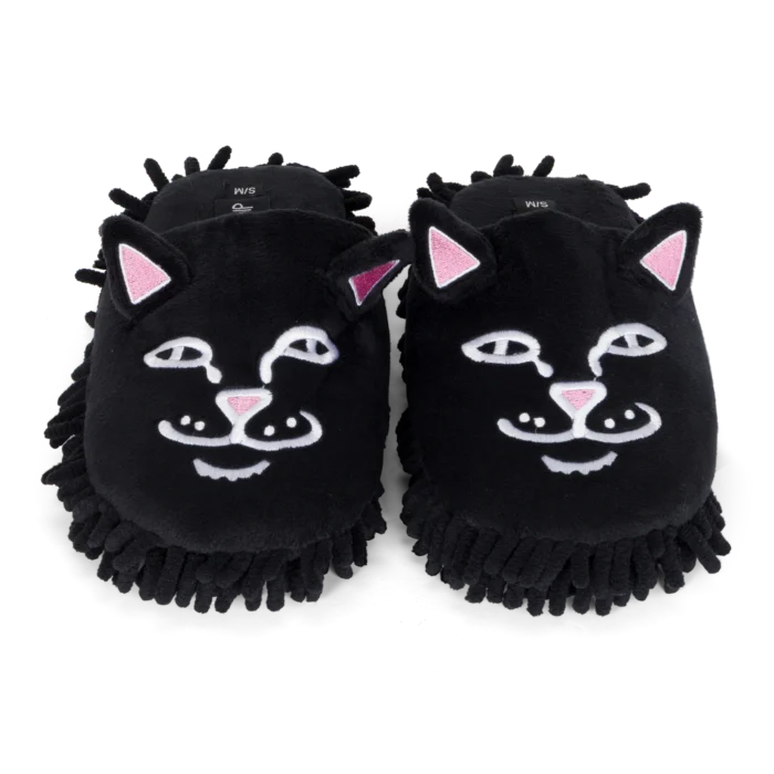 Limpia tu casa con estilo y flojera nivel experto. Estas pantuflas de Ripndip presentan el rostro bordado de Lord Nermal sobre un suave tejido de felpa negra. Lo mejor: la suela tipo mopa (mop) atrapa el polvo mientras caminas. Comodidad absoluta, diseño irreverente y funcionalidad para tu día a día en casa.