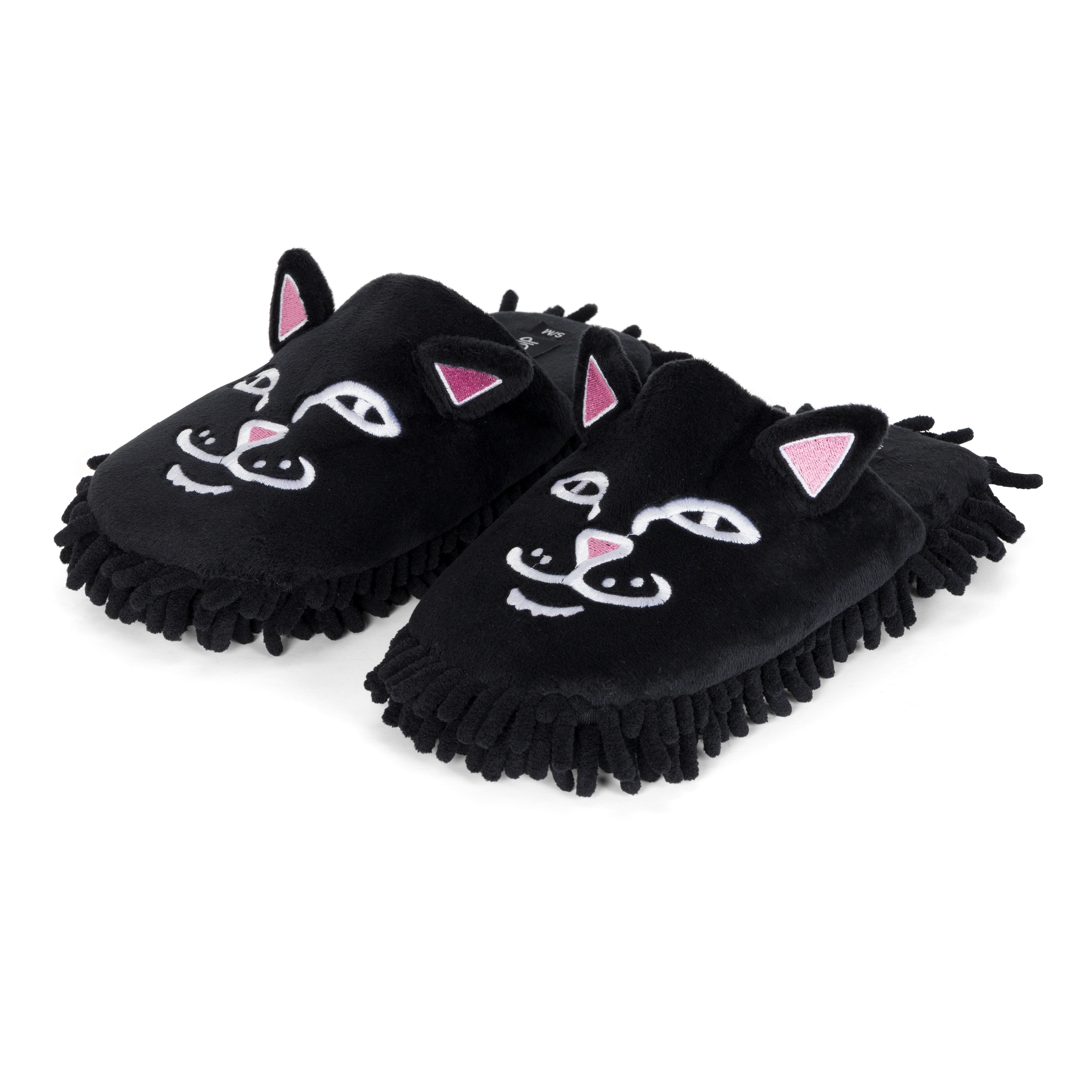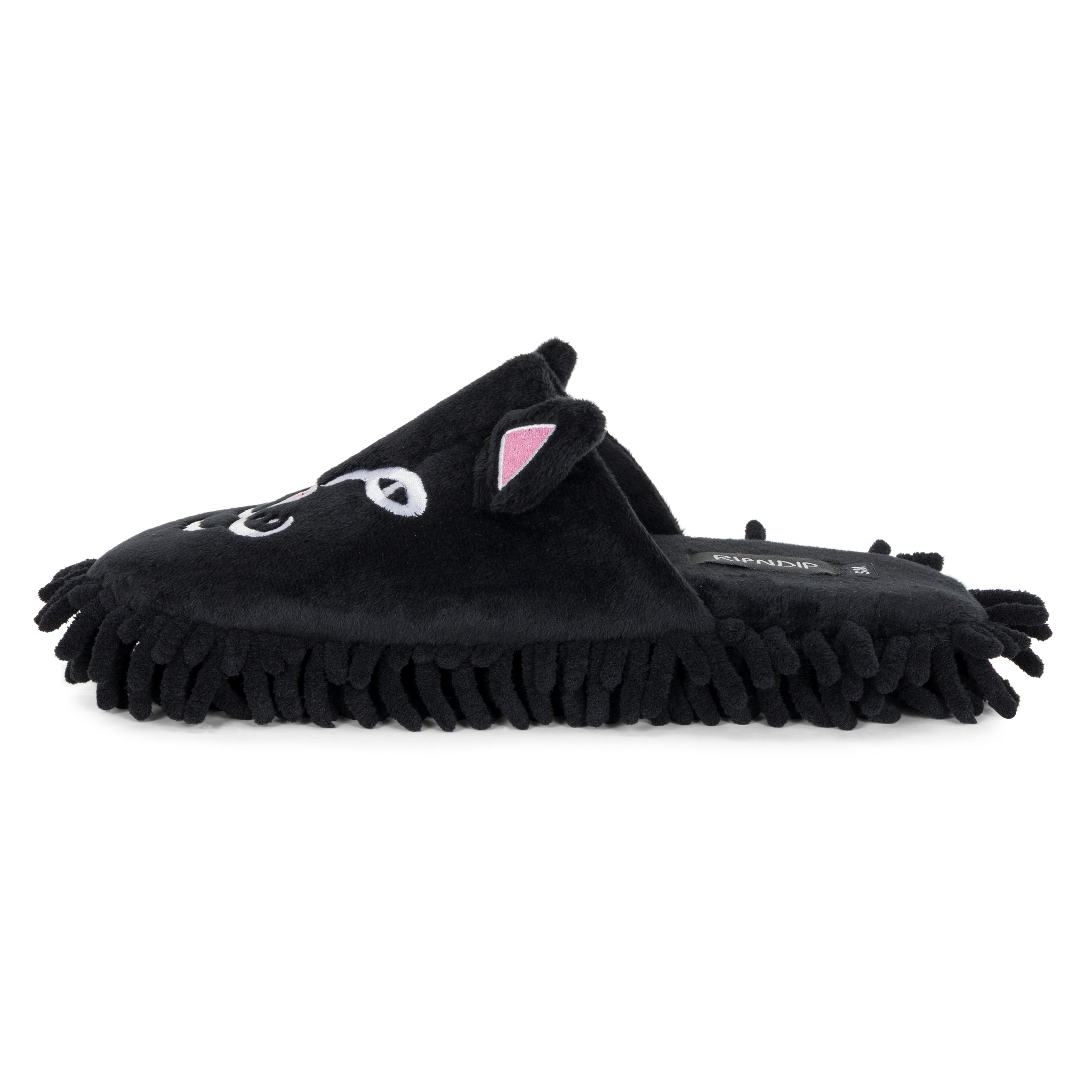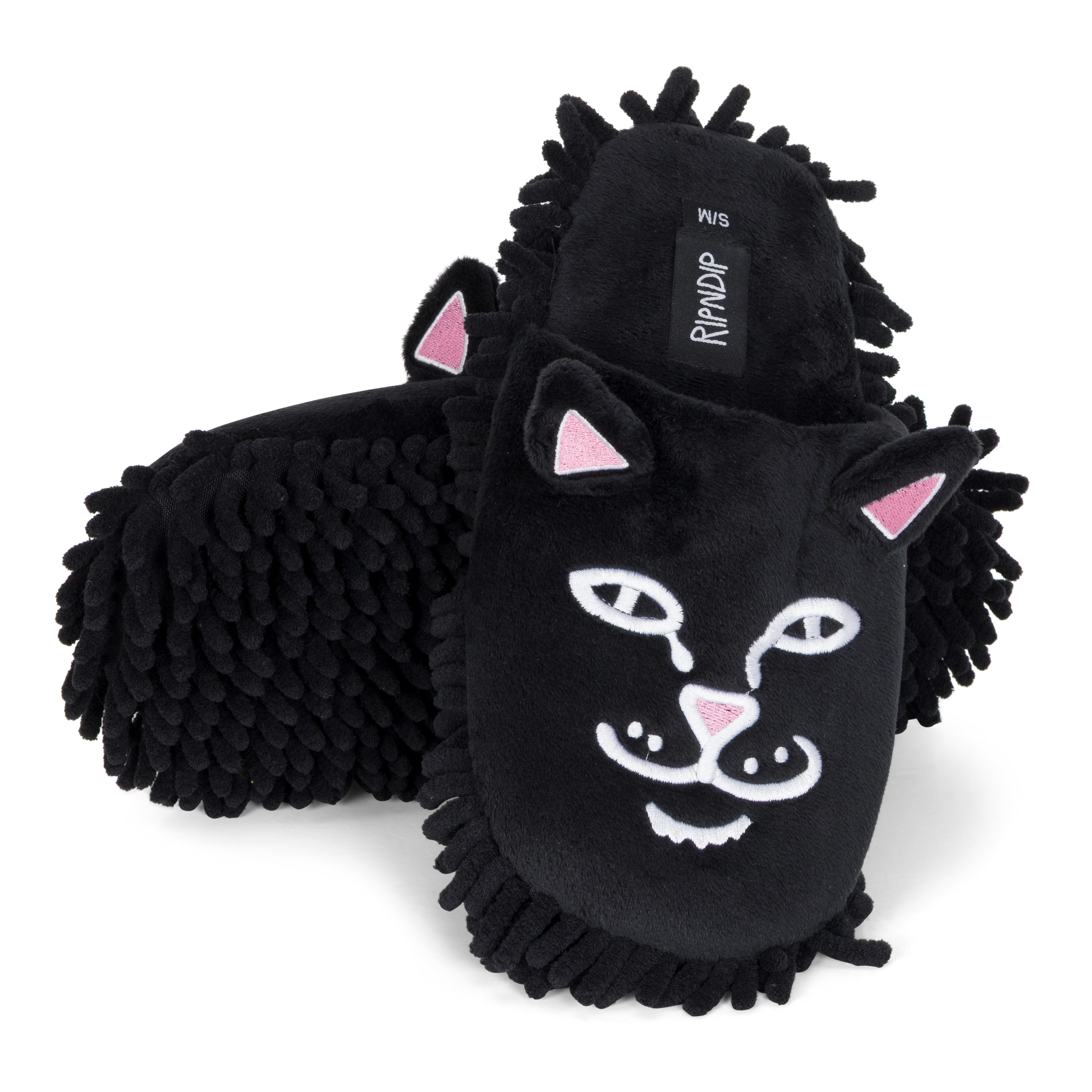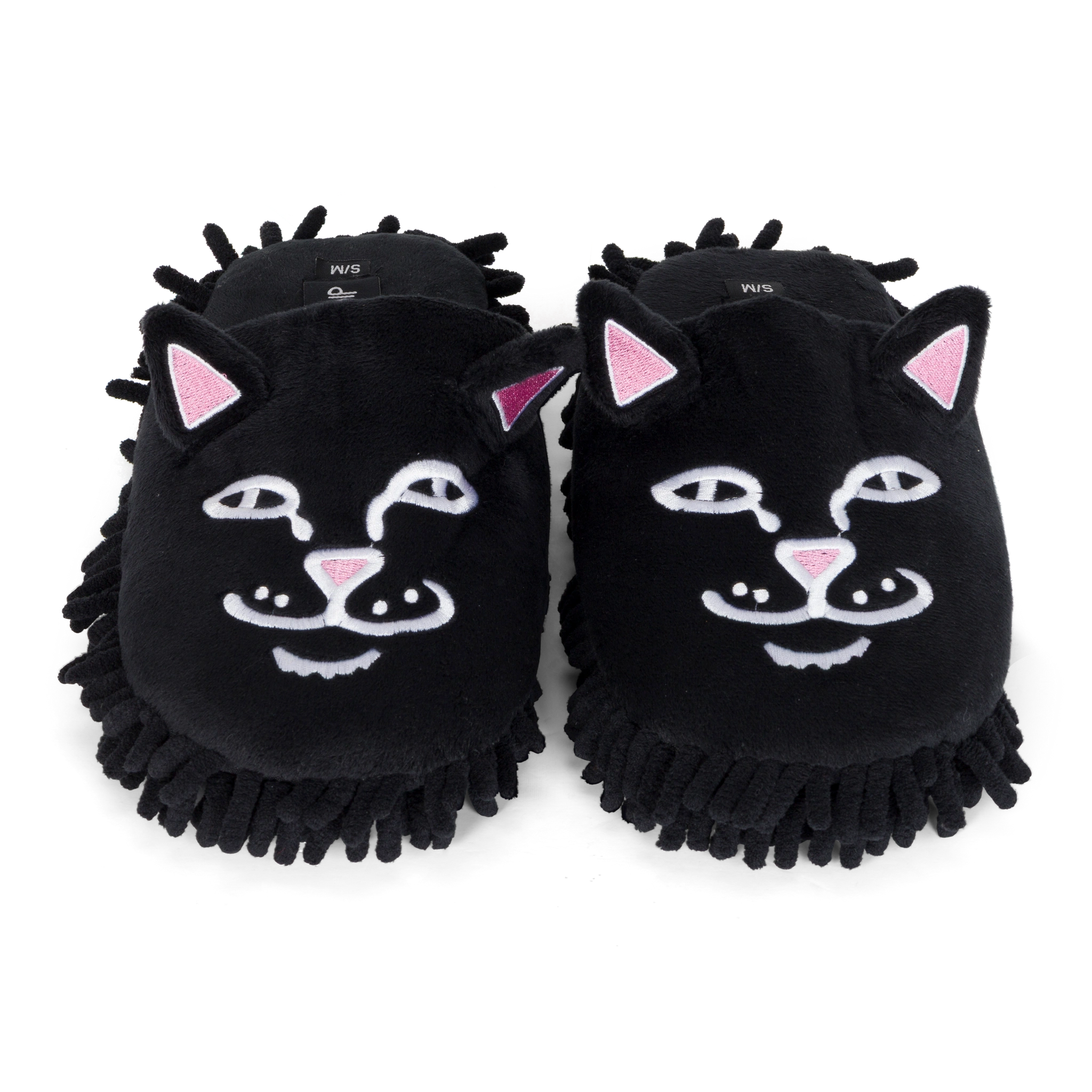Limpia tu casa con estilo y flojera nivel experto. Estas pantuflas de Ripndip presentan el rostro bordado de Lord Nermal sobre un suave tejido de felpa negra. Lo mejor: la suela tipo mopa (mop) atrapa el polvo mientras caminas. Comodidad absoluta, diseño irreverente y funcionalidad para tu día a día en casa.