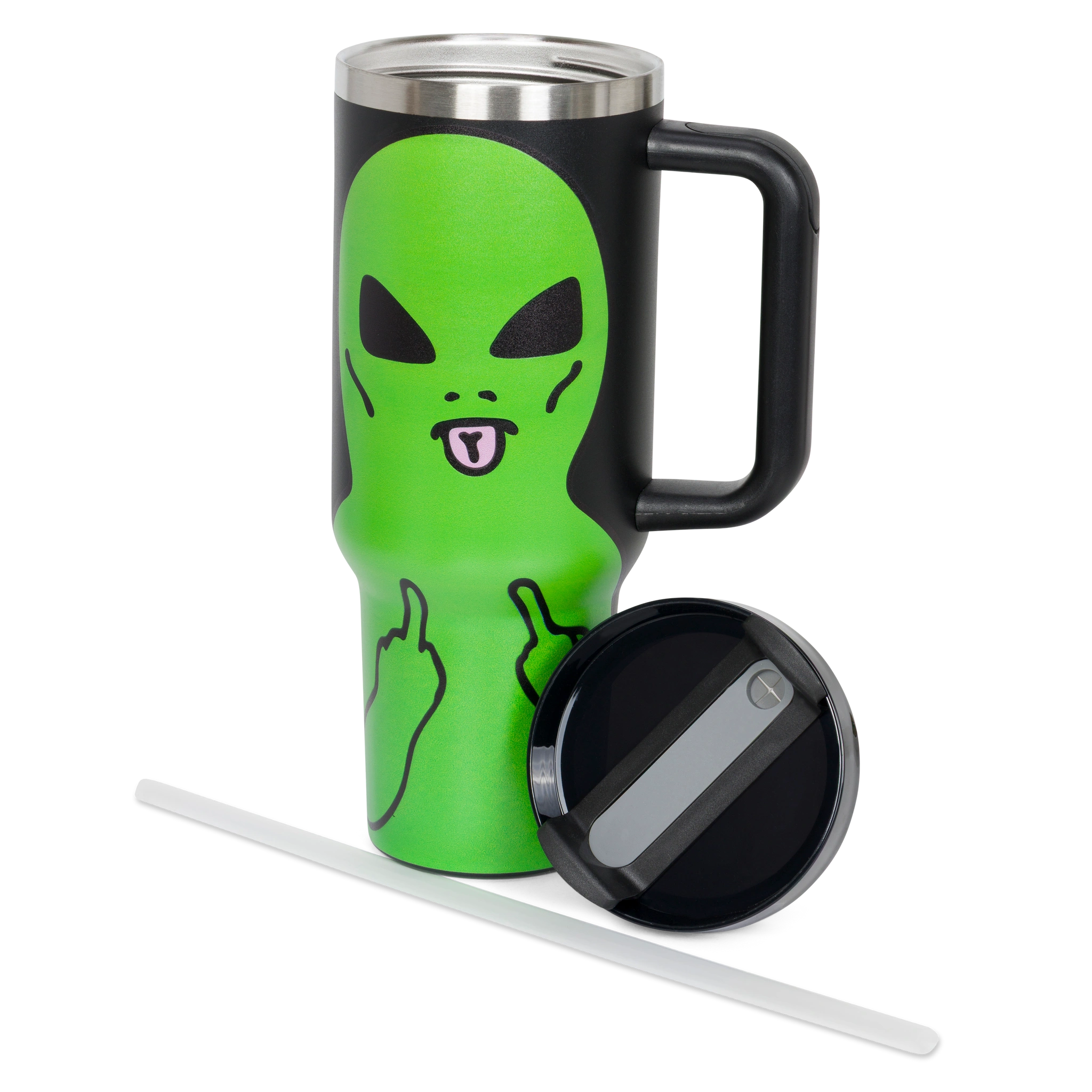 Mantén tus bebidas a la temperatura ideal con todo el estilo de Ripndip. Este tumbler de acero inoxidable cuenta con un diseño de Alien en verde vibrante sobre fondo negro. Incluye mango ergonómico, tapa hermética y bombilla, siendo el accesorio perfecto para viajes, oficina o sesiones de skate.