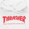 ThrasherPoleron con capucha de corte estándar, confeccionada con algodón y poliéster de cultivo sostenible y justo de EE. UU. Cuenta con cordón ajustable, bolsillo tipo canguro, etiqueta cosida y acabado con diseño en el centro del pecho.