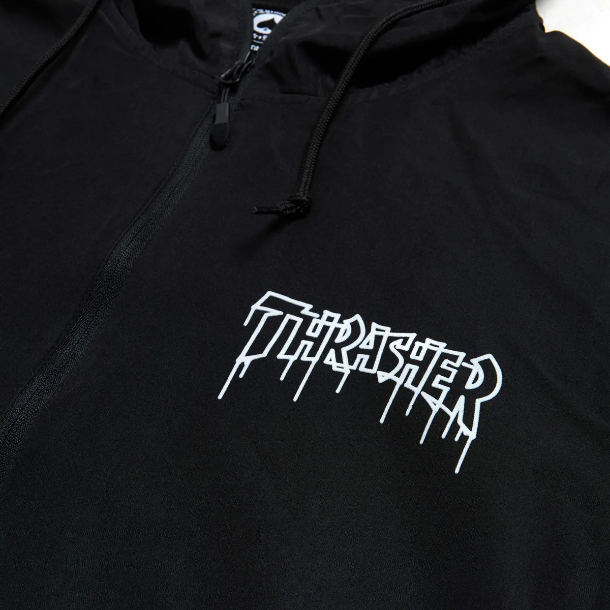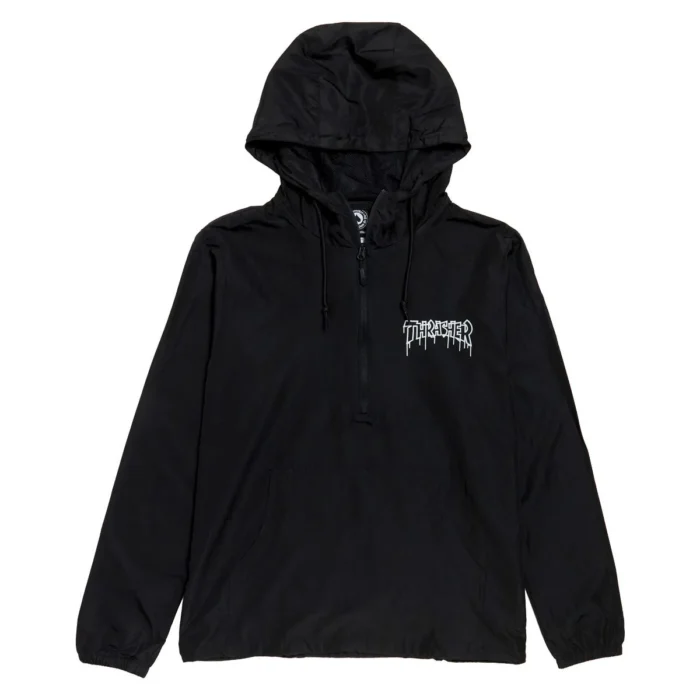 Thrasher- Chaqueta cortavientos ligera tipo anorak con tejido 100 % poliéster resistente al agua, con media cremallera frontal, cuello tipo neopreno, capucha de tres paneles con forro de malla y bolsillos de ribete.