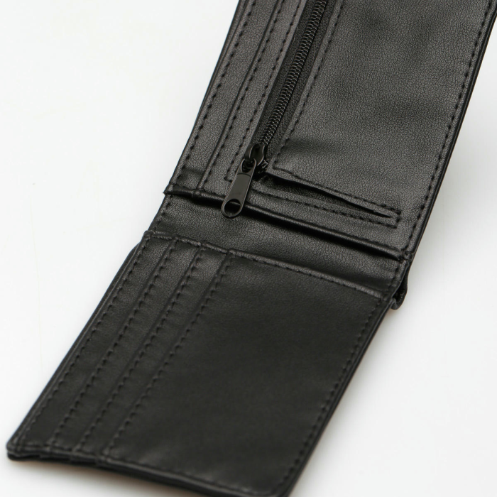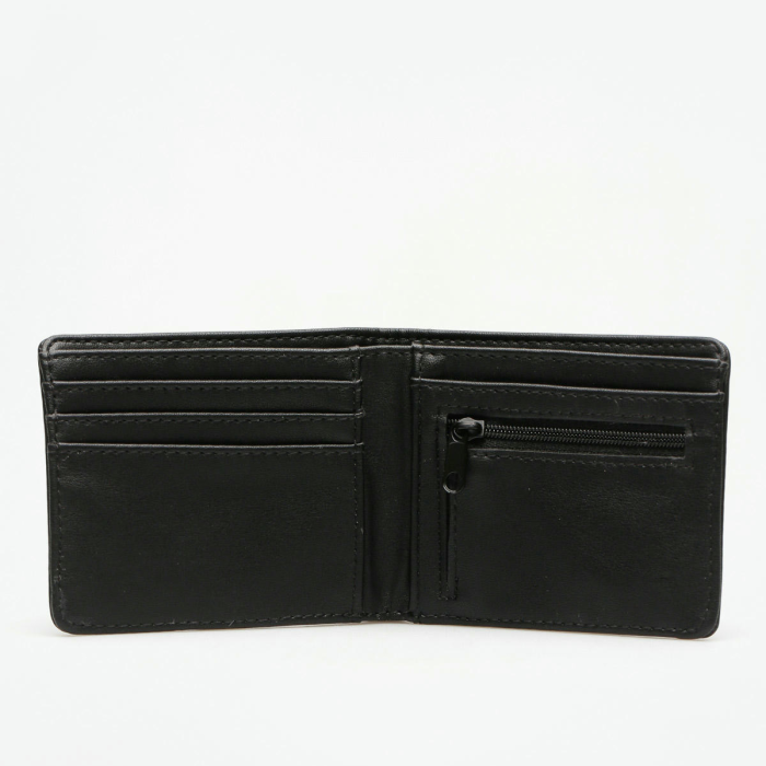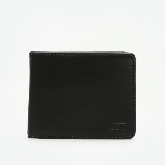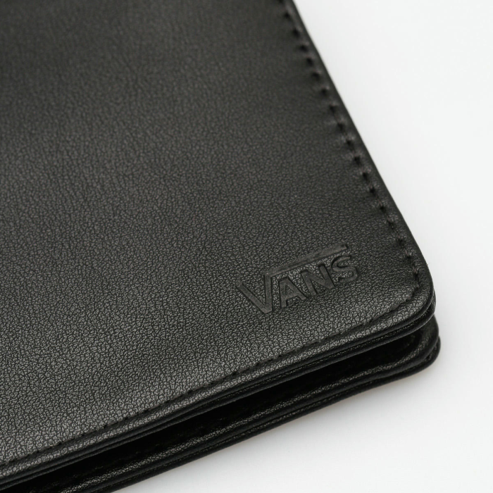 La billetera plegable Drop V Bifold está fabricada en poliéster 100 %, tiene cremallera y el logotipo “Off the Wall” de Vans repujado.