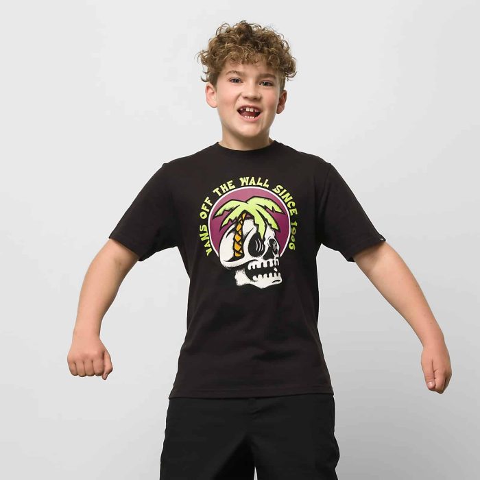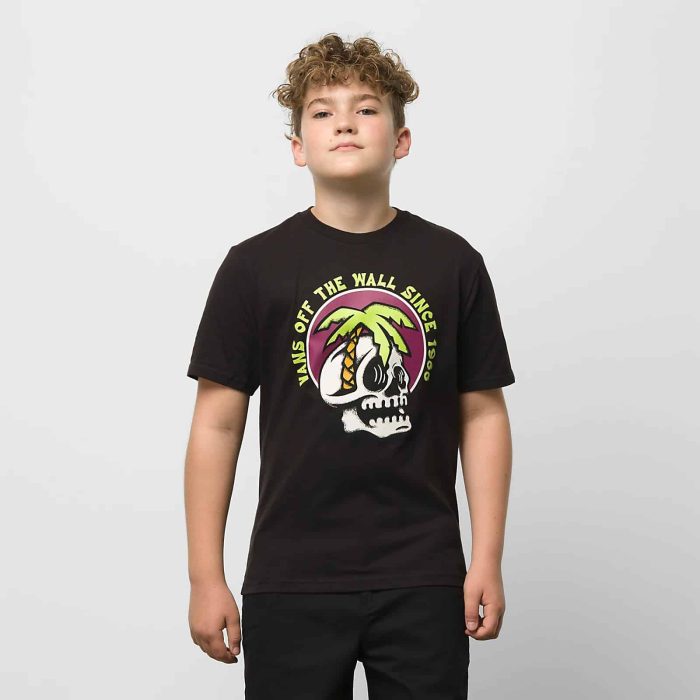 VansLa polera de niño Palm Visionary está confeccionada en 100 % algodón hilado en anillos y peinado con mangas cortas y gráficos de calaveras y palmeras en la parte delantera.